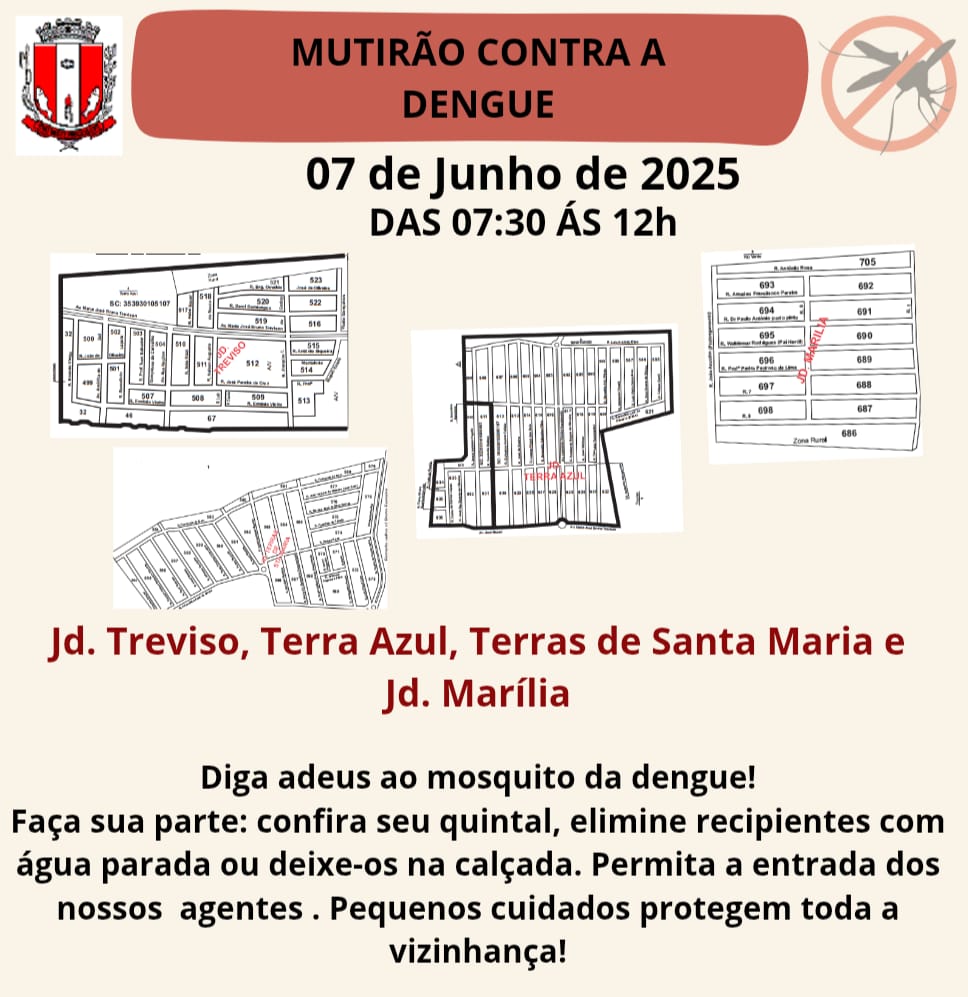 A Secretaria Municipal de Saúde, promove neste sábado, 07 de junho, mais uma etapa do Mutirão de Combate à Dengue, ação que tem percorrido diversos bairros da cidade com o objetivo de eliminar focos do mosquito Aedes aegypti, transmissor da dengue, zika e chikungunya. Este será o penúltimo mutirão do ano, e a ação acontecerá das 7h30 às 12h, atendendo os bairros Jardim Treviso, Terra Azul, Terras de Santa Maria e Jardim Marília.