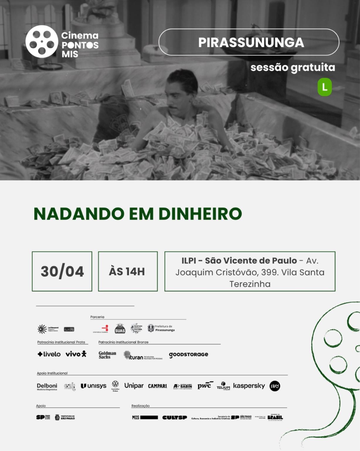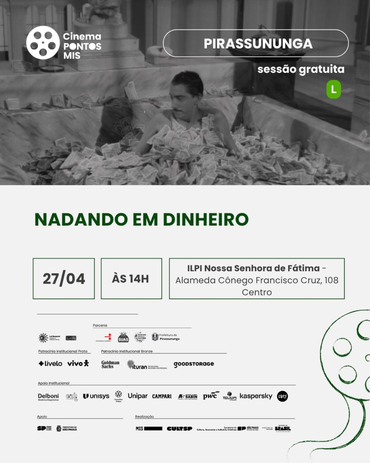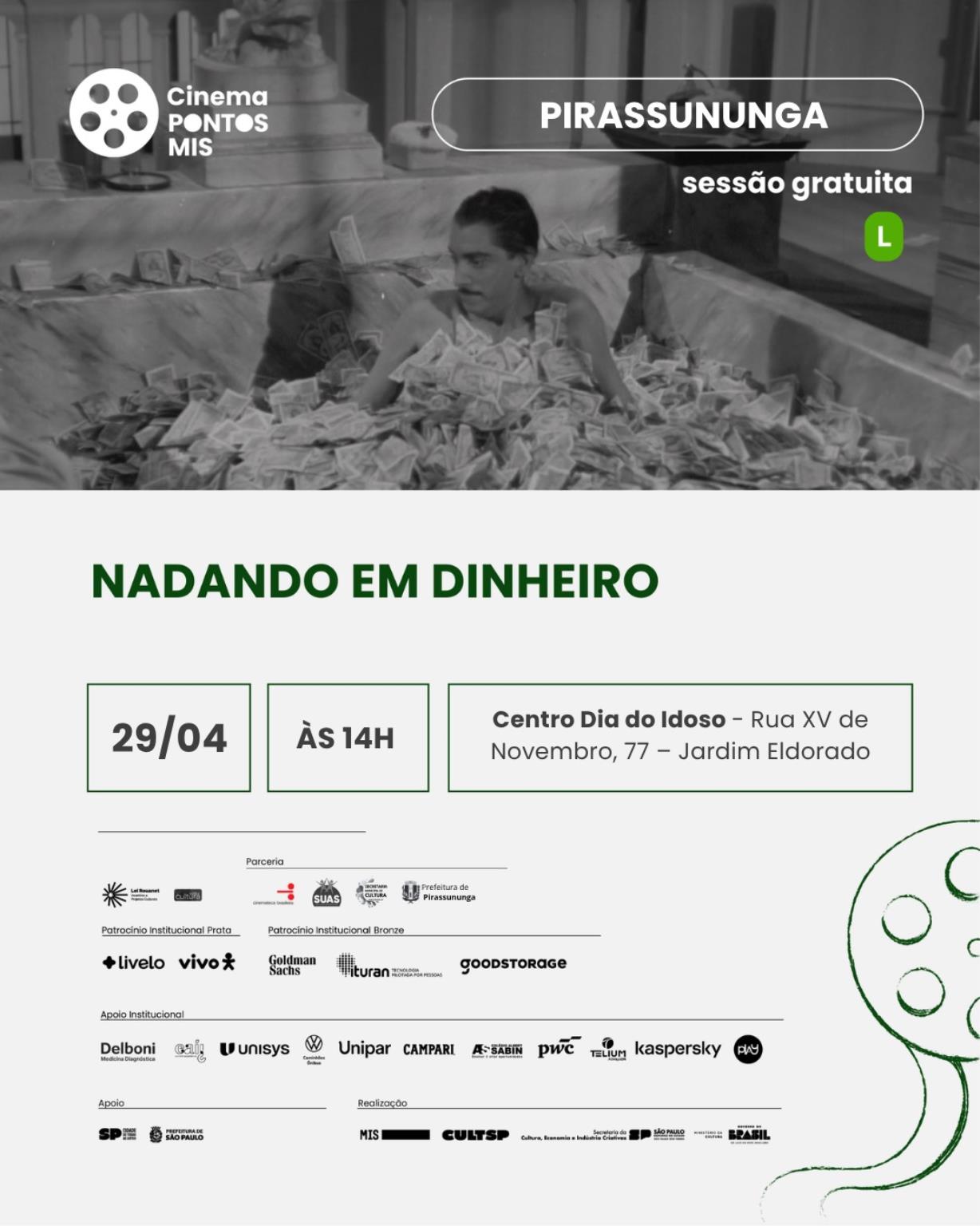 Nesta edição, o público poderá assistir gratuitamente ao filme Nadando em Dinheiro, clássico da cinematografia nacional estrelado por Amácio Mazzaropi. A produção apresenta, com humor característico, a história de um homem simples do interior que passa a viver situações inesperadas após se ver cercado por dinheiro.