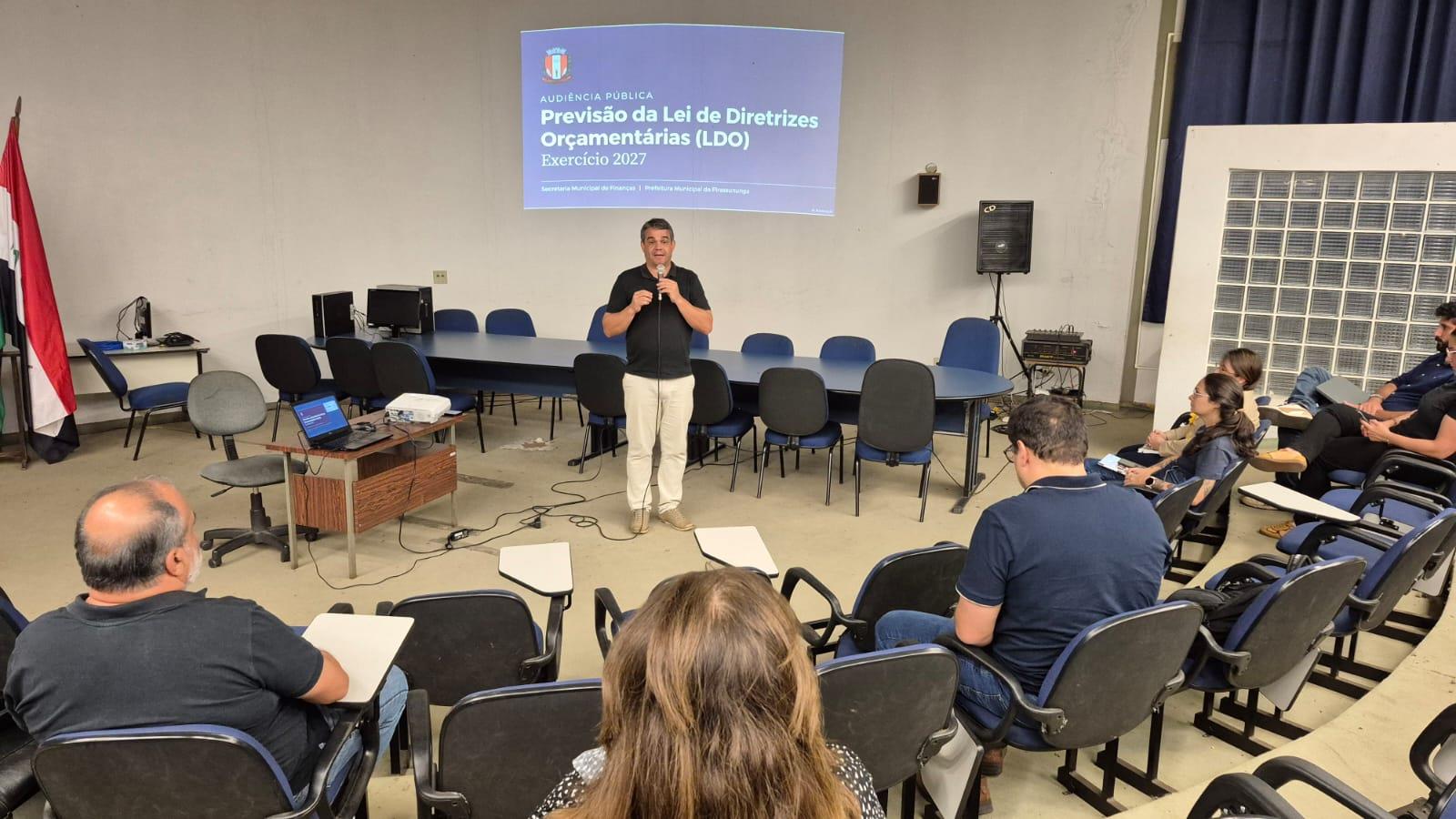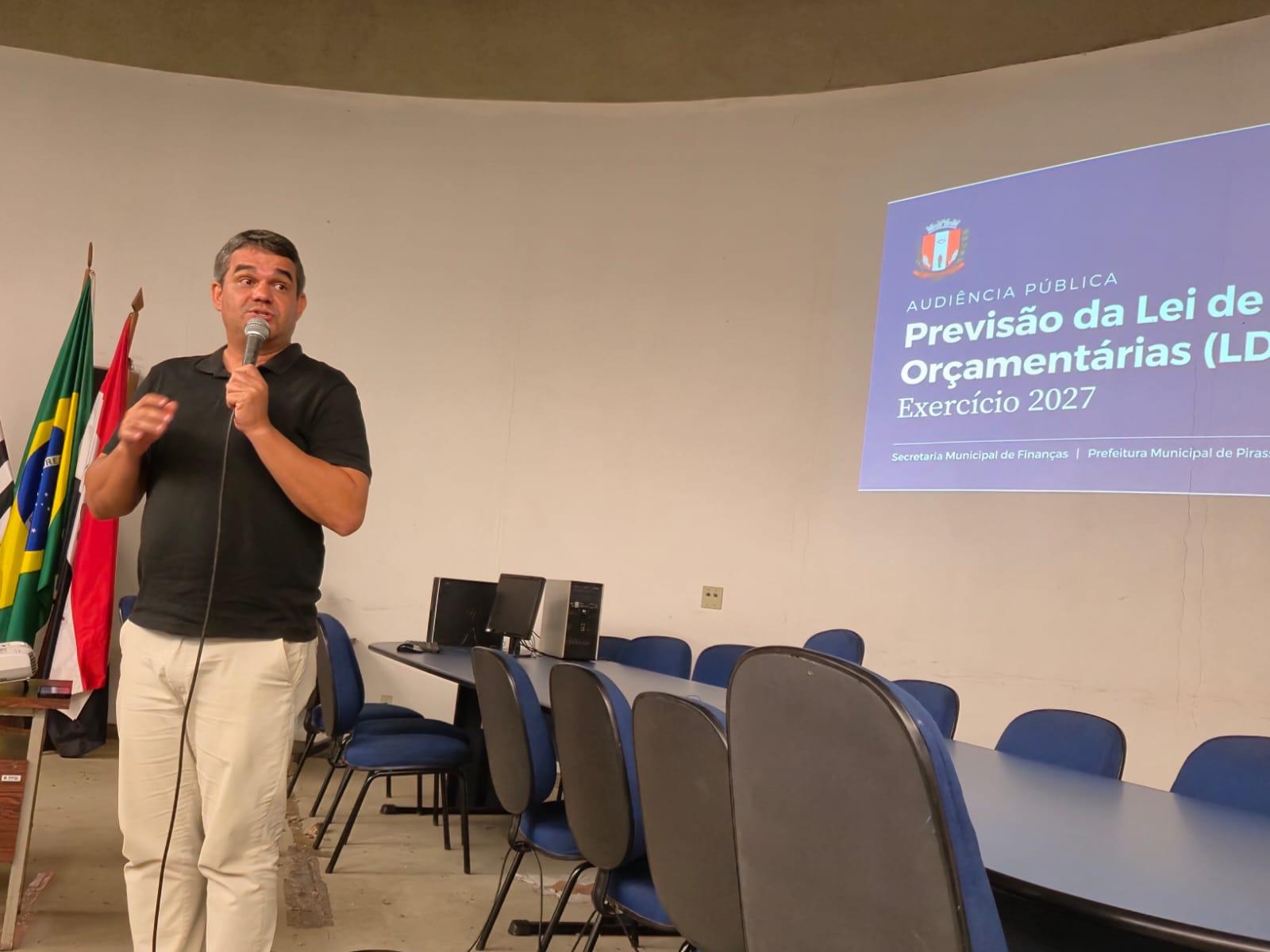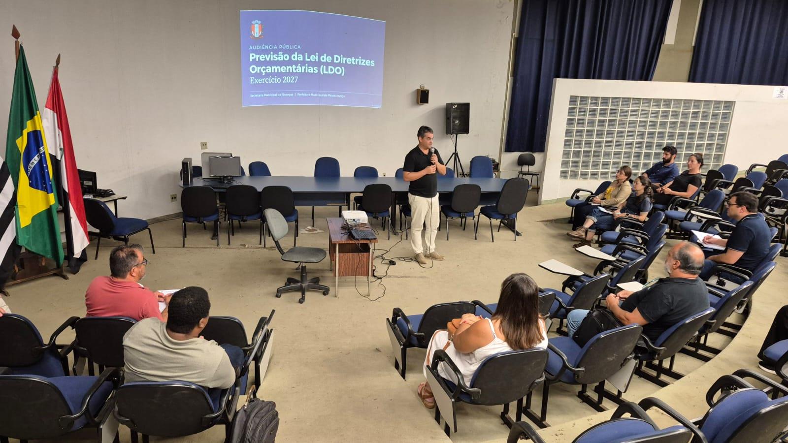 A Prefeitura Municipal de Pirassununga realizou, na noite da última quarta-feira (22), no Auditório do Paço Municipal, a primeira audiência pública destinada à elaboração participativa da Lei de Diretrizes Orçamentárias (LDO) para o exercício de 2027. O encontro teve início às 18h40 e foi encerrado por volta das 21h30, reunindo cerca de 20 participantes entre servidores, representantes da sociedade civil e munícipes interessados em acompanhar a construção do planejamento financeiro do Município.
