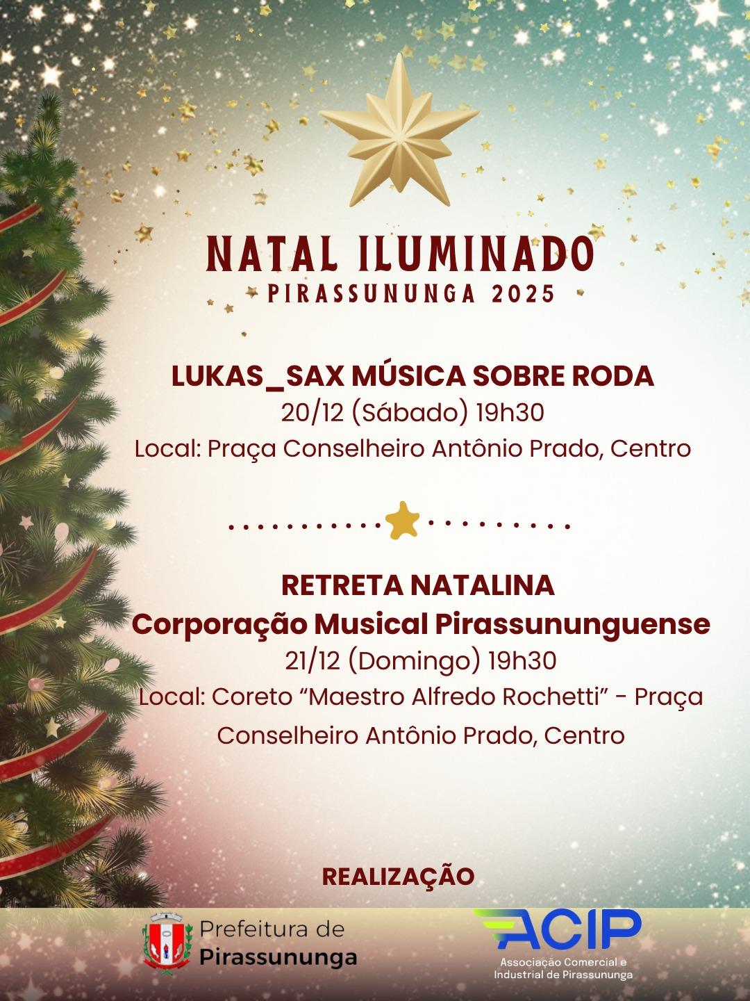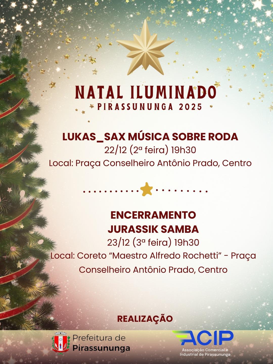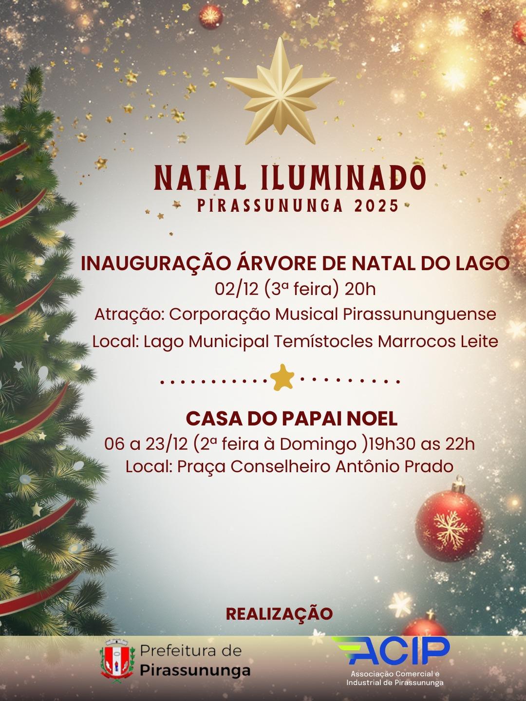 A Prefeitura Municipal de Pirassununga, em parceria com a Associação Comercial e Industrial de Pirassununga (ACIP), dará início à programação do Natal Iluminado 2025, que levará ao Centro da cidade uma série de atrações culturais gratuitas entre os dias 02 e 23 de dezembro.