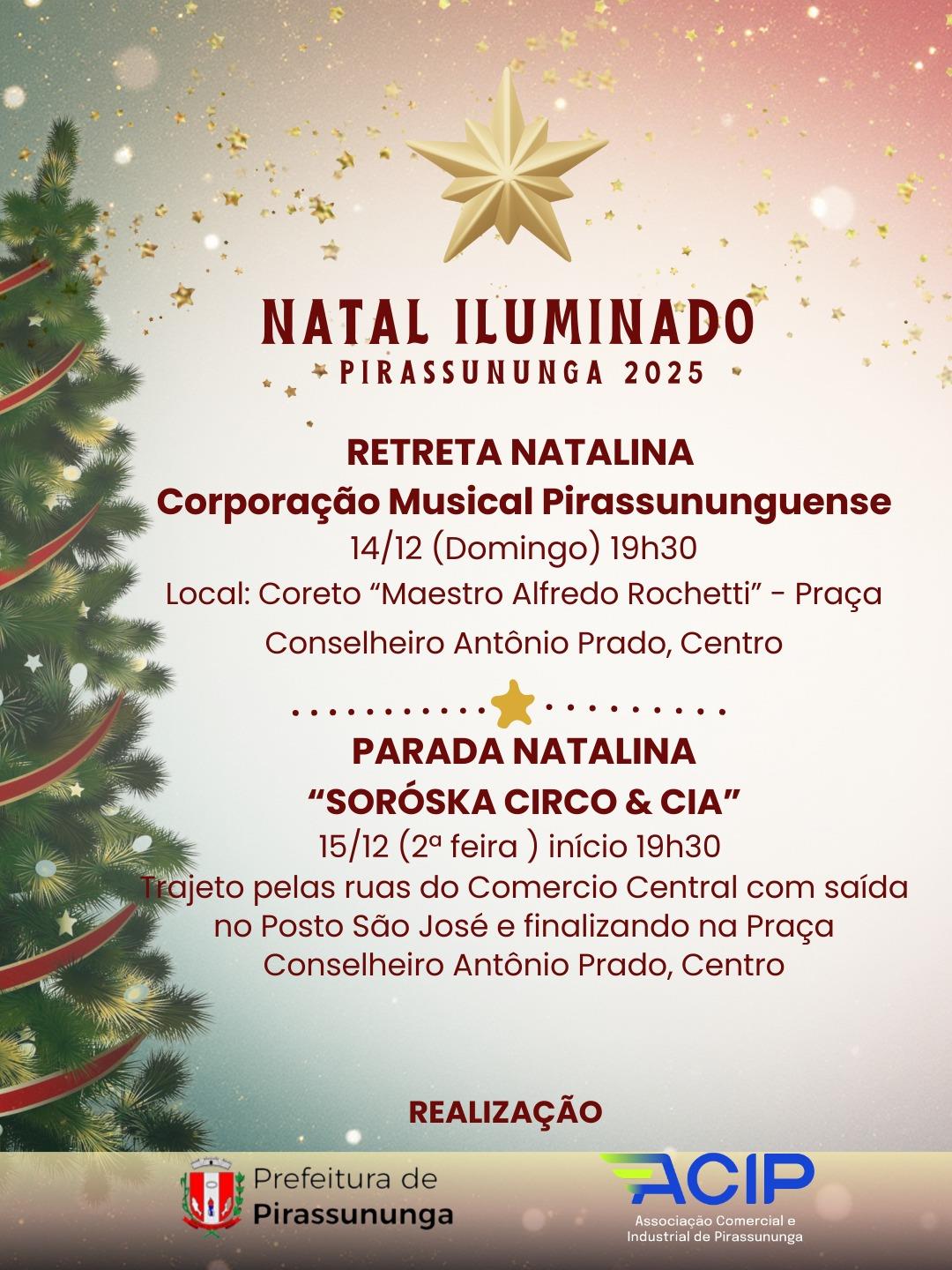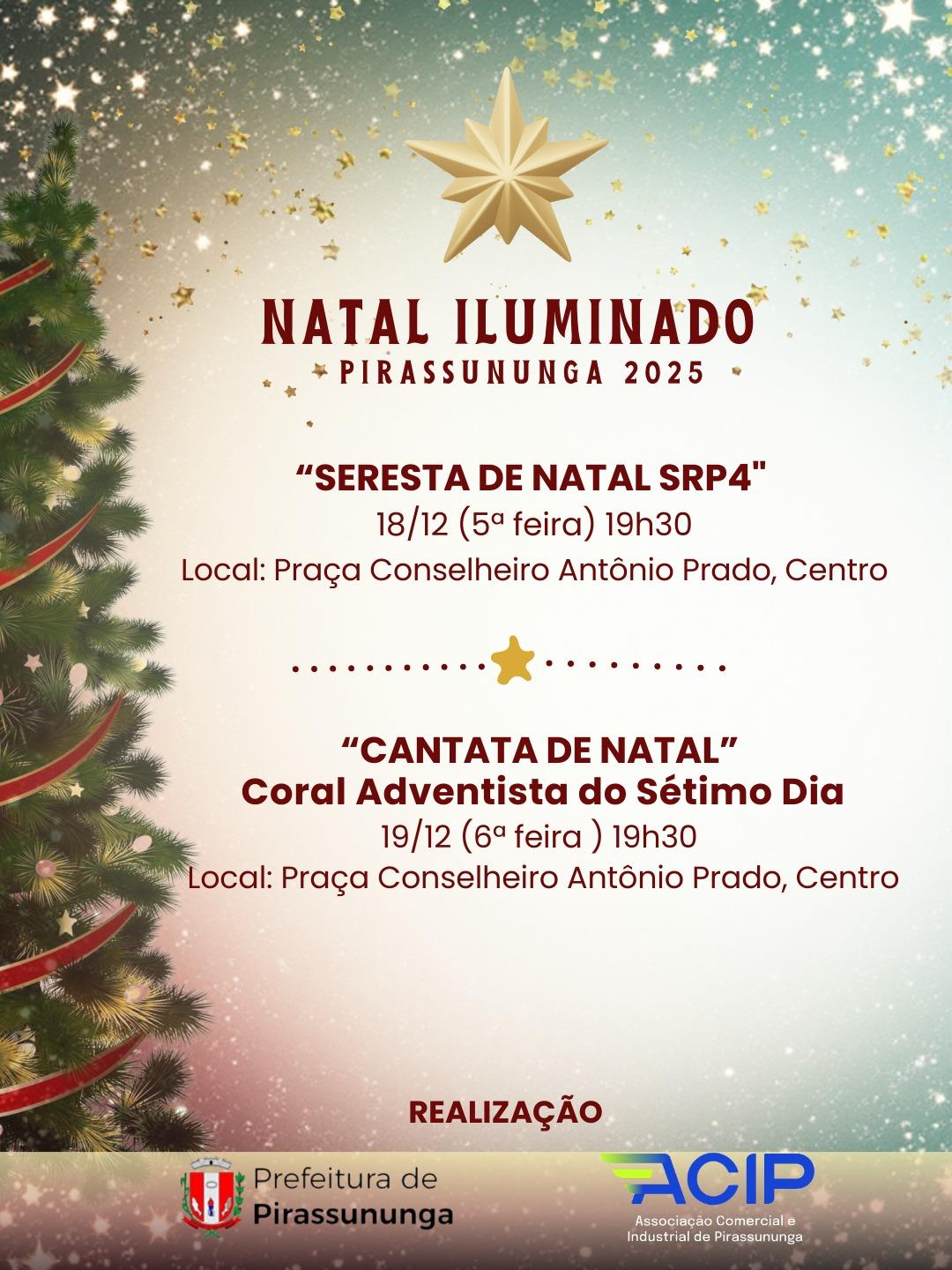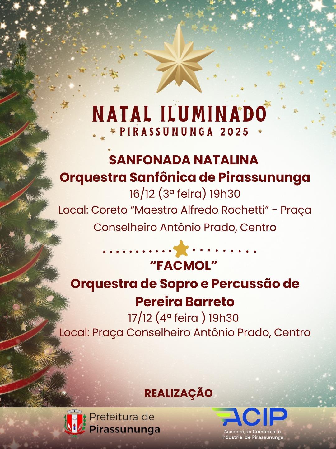 A Prefeitura Municipal de Pirassununga, em parceria com a Associação Comercial e Industrial de Pirassununga (ACIP), dará início à programação do Natal Iluminado 2025, que levará ao Centro da cidade uma série de atrações culturais gratuitas entre os dias 02 e 23 de dezembro.