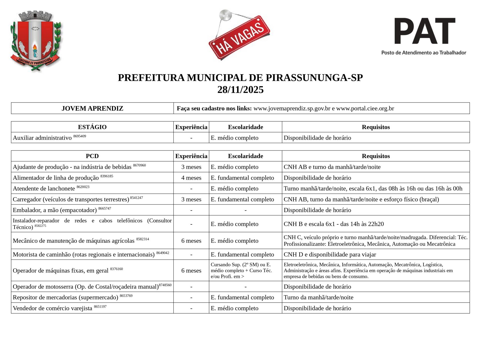 Arquivo em PDF com as vagas: Vagas Disponíveis 28-11-2025
